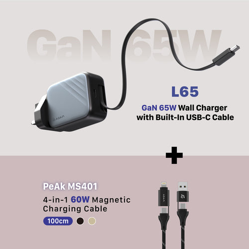 L65 UK GaN 65W Wall Charger with Built-In USB-C Cable + PeAk MS401 4-in-1 60W Magnetic Charging Cable